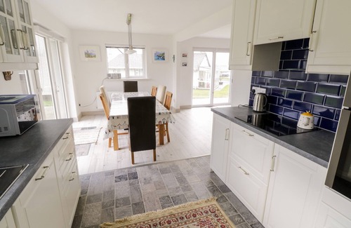 This detached holiday home has three bedrooms, a ground-floor double, a double with an en-suite cloakroom, and two doubles, along with a ground-floor shower room and an open-plan living space with a kitchen, dining area and sitting area. Appliances include an electric oven and hob, microwave, fridge/freezer, washing machine and dishwasher, and for entertainment, there is a TV with free-to-air channels and WiFi. Outside, there is off-road parking for two cars and a wrap-around garden with a lawn and patio. Fuel, power, bed linen and towels are all included in the rent. Sorry, this is a pet-free, smoke-free property. You can find a shop, pub and beach within 0.9 miles. Highchair and travel cot available. Please note that the garden is not enclosed and there are steps to the exterior. 38 Carrowhubbock Holiday Village makes a lovely seaside escape.