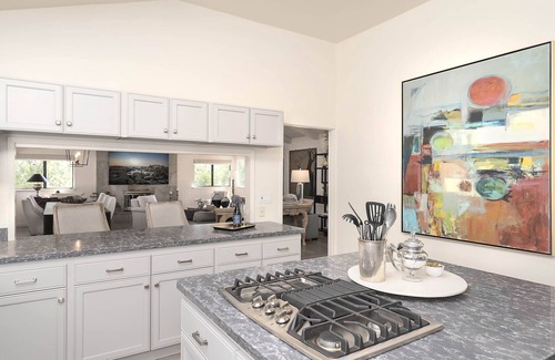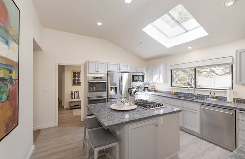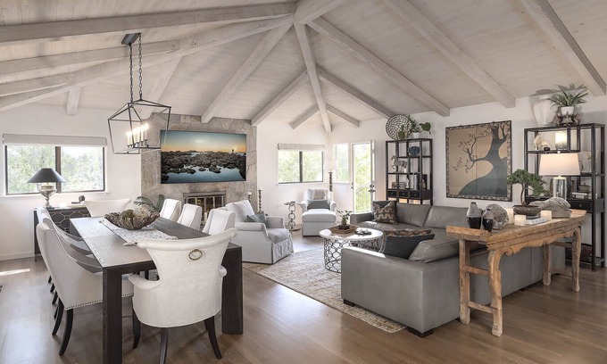 The property is located on a quiet cul-de-sac and has a secluded feel, yet is just a few blocks away from shopping, dining and other attractions in downtown Carmel-by-the-Sea. Built in 1949, the 2,600-square-foot main house has been updated and renovated but still has a mid-century modern vibe. White-washed open beam ceilings, natural stone floors, and skylights and large windows that let in natural light are highlights of this home.