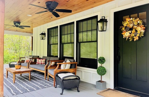 Our newly constructed custom designed home has a wrap around porch, screened in room overlooking a creek with sectional dining seating, back grilling porch, chefs kitchen with island, built in bar, dining table, and cozy sectional and fireplace in open concept living area. The first floor also has a half bath and sleeping nook with a twin sized bed. Upstairs you will find a primary bedroom suite with seating are, coffee station, built in desk and custom closets, as well as a large cast iron jetted tub, custom double vanity, tiled shower and water closet. Down the hall, also on the second level, you will find a wardrobe and with linens, towels, and extra pillows and blankets. A tiled bathroom with shower is shared by two queen-sized bedrooms. Walk to Washington county beach where you will find tennis and basketball courts, grills, picnic tables, swings, bathrooms and areas for yard games. In season, there is also golf, a marina with a store, an ice cream shop, and bar. Black mountain and additional hiking areas are near by.