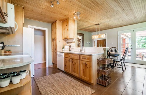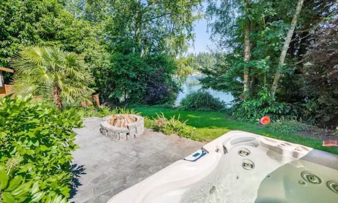 Take it easy at this unique and tranquil getaway. This private 3-bedroom home is situated in a serene setting, furnished with plush furniture perfect for recharging. The hot tub and firepit space are setup for entertaining- enjoy the private swim dock and views of lake.