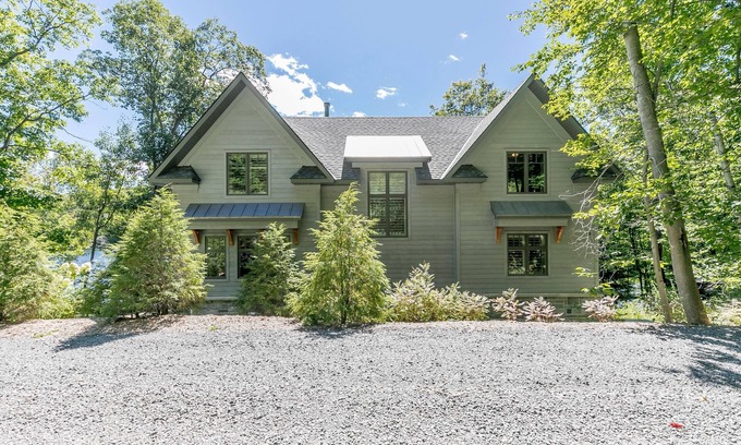 ECHO BAY LAKEHOUSE is a brand new build just 50ft from the water's edge! The beautifully landscaped yard begins the moment you step out of the car, leading you down the stairs to the entrance and further down to the lake. Clear, deep water off the dock awaits your best cannonball! The deck features two Muskoka chairs and a sectional sofa with an umbrella to escape the sun. A shallow sandy entry can also be found along the shore, where you can lounge in a lawn chair and dangle your toes in the water! Half-way up, a fire pit with 4 Muskoka chairs overlooks the calm bay, inviting you to cozy around as the sun goes down.
