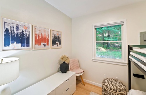 The Wabi Sabi Cabin comfortably hosts up to 6 guests, making this ideal for couples, friends, or families. All bedrooms are furnished with 100% cotton bed linens and room darkening shades. The primary bedroom suite features a King bed, dedicated work desk, and sitting & reading area. The secondary bedroom features a Queen bed. The cozy, bunk bedroom features a Twin bunkbed with a built-in safety ladder and dresser.