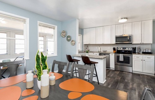You’ll have the entire unit to yourself. Parking is available on the street on a first come first serve basis and with no restrictions. Contactless check in is provided by keypad. It’s the upper unit of a double townhouse and the red entry door is on your left.
