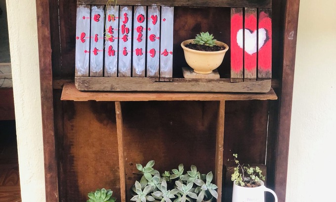 2 bedrooms have windows that look to the yard, and 01 bedroom does not have windows facing the yard. A small kitchen with full facilities (refrigerator, cooker, electric stove, gas stove, oil-free fryer, dining table with 4 sits). An iron, hot water, a hair dryer, a drying ground, a small bookshelf, a television, internet, and a projector for rent. A shared bathroom and 2 toilets (one inside, one outside), herbal shampoo, and bath soaps. There is some chilling spaces outside with sofas and benches placed in the yard with steps leading to the garden. It's an ideal house for a small family on a vacation suitble for remote working. Significantly, the garden has some special and common plants in Vietnam such as sương sâm (for green jelly), lá nếp cẩm (for food coloring), lá dứa thơm (an aromatic plant for sweet desserts). Plus, most plants have aromas such as lavender, rosemary, mint, thyme, lemon grass, Iris...