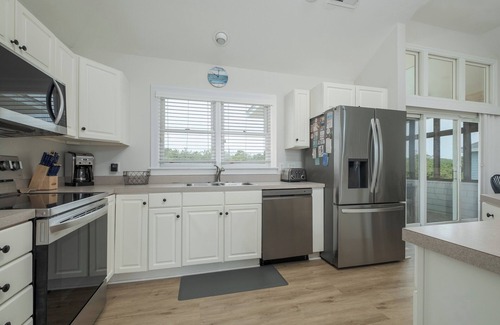 Perfect for 2 families, Tipsy Tides features 2 master bedrooms each with a private deck, plus a den for the kids. The top level is ideal for gathering with friends and family after long beach days. The kitchen is fully equipped and ready for the chef in your group, with seating for 4 at the breakfast bar and 8 at the dining table. A screened-in porch makes for the perfect spot to enjoy breezy Outer Banks evenings.