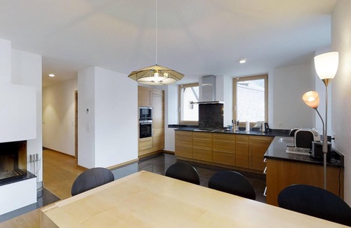 4 1/2 room apartment on the first floor with approximately 110m2, elevator to the apartment, entrance hall with hall stand, large living / dining room with fireplace, three bedrooms and two bathrooms (washing machine and dryer in one of them). Kitchen with dishwasher / oven / microwave / refrigerator / coffee Chicco d’Oro machine, open to the living room. The apartment has wireless internet. The garage is located near the house.