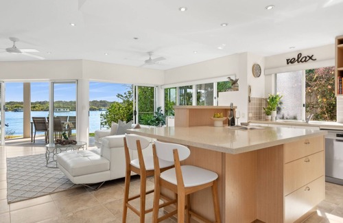 Relax on the undercover terrace, where lush gardens and a palm-fringed lawn extend right to the water's edge. The spacious open-plan living area flows effortlessly to the outdoor entertaining space, where you can enjoy breathtaking views of the river and its vibrant activity – from kayaks and canoes to the iconic Noosa Ferry.