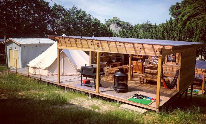 A glamping site with a very spacious deck