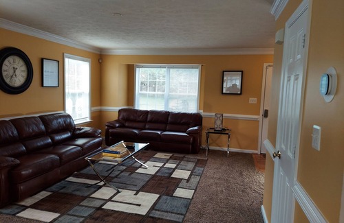 Foyer, Half Bath, Living Room with large cozy leather couches, big Kitchen, spacious dining area, back door leading to the deck. Kitchen is fully equipped with wine glasses, plats, cutlery, pot & pans, knives, kettle, keurig coffee machine, and a blender.