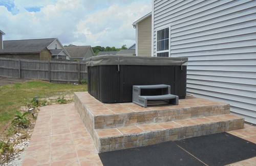 on our back patio, Included is a hot tub for 8 {less than a year old} on a large patio out back. we also have a patio set that holds 6. hot tub directions are posted by the back door.
