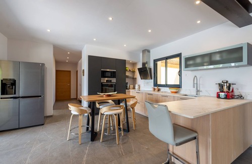 It also has a central island, ideal for enjoying an aperitif while cooking, and adjoining this room is a French window overlooking the garden/pool and shaded terrace, perfect for serving meals al fresco.