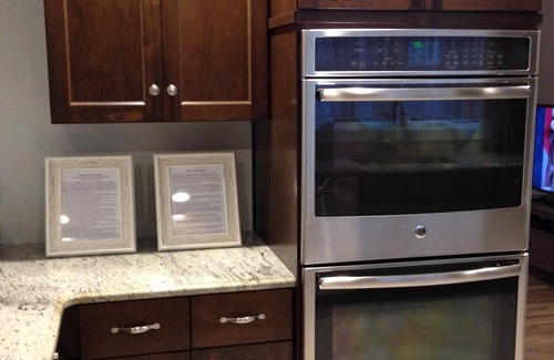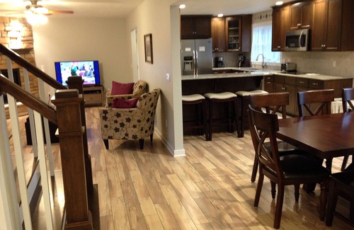 The ground floor of this condo is accessible. Ground level entry, a fully furnished kitchen with granite counter tops, Laundry room with large capacity washer and dryer, 2 car garage with a 2nd fridge, stainless steel appliances, 2 King beds, 3 Queen Beds and 1 Queen futon in the loft. There are 2 master bedroom suites (1 up and 1 down) and two add'l quest bedrooms (1 w/1 Queen bed and 1 w/2 Queen beds). So there are 2 King Beds and 3 Queen beds in bedrooms. There is a tub and and a separate shower in lower master. There are 4 full bathrooms. Stone gas fireplace in the living room, loft area for reading and entertaining upstairs, lower level bath is accessible with easy no step access to the shower. Free wifi, Free unlimited in and out of State Long Distance Calling - this is very important since many visitors to the county find that they have poor cell phone reception.