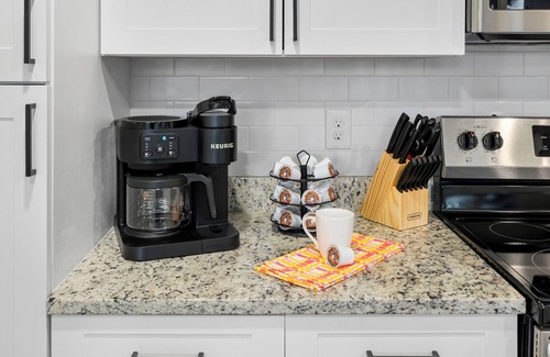 - Fully stocked kitchen with Keurig, blender, microwave, oven, and dishware