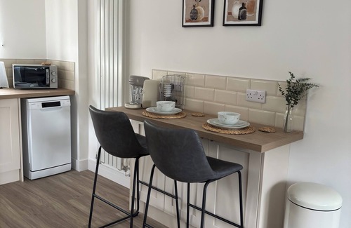 It has 4 bedrooms, 1 full bathroom, an en suite, downstairs toilet, a large kitchen, utility, dining room/study, living room and garden space. The house is family friendly and also perfect for professionals/contractors or a group of friends. The spacious living room has a smart TV, coffee table, sofa and armchair. A selection of children’s books/colouring/toys and adult puzzle books/games are provided. It leads into a dining room which includes a great little designated desk area ideal for those that need to work or study from home. The dining room leads into the utility equipped with washing machine, sink, tumble dryer and a beer fridge. It also leads into a large modern kitchen with a breakfast bar and all the essential appliances, utensils and cutlery you would need. There is also a downstairs toilet.