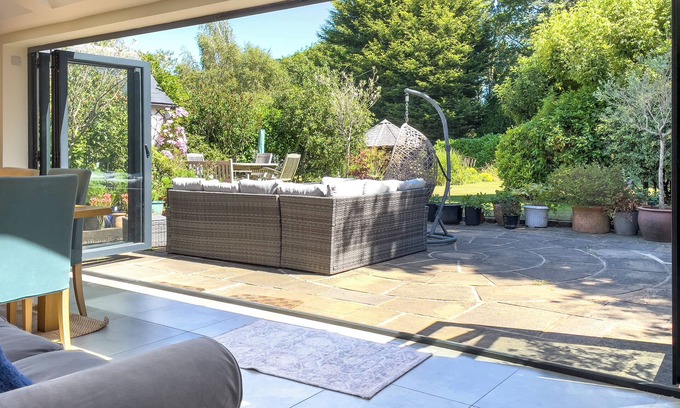 The house blends modern comforts with 18th-century charm. The large open-plan living area combines the kitchen, lounge, and dining room, with bifold doors leading to a patio and mature gardens. Outdoors, enjoy multiple seating areas or a cosy dining hut by the pond.