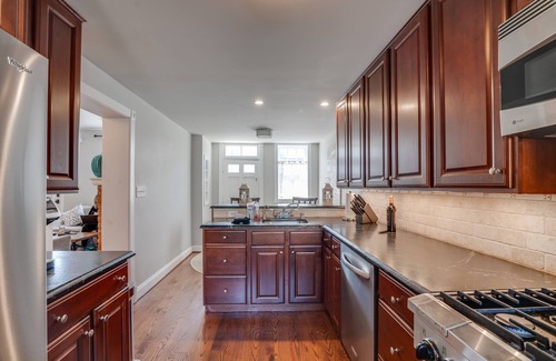 Big handsome 4-Level town home in the Frederick Historic District has been renovated from top-to-bottom. Features a true gourmet kitchen with a large gas range, soapstone counters, breakfast bar and stainless steel appliances. Relax in the evening on your private patio with fire table, or your living room reclining couch with gas fireplace. Main level bedroom with queen bed and full first floor bathroom, with 3 bedrooms and 2 full bathrooms on the 2nd floor. All bedrooms have flat-screen TVs. Balcony, a sitting area, as well a laundry center are on the upper level for convenience. Private parking for 2 cars in the rear, with additional free parking. Wheelchair accessible. Towels and linen provided. Walk to Baker Park, which is directly behind or to downtown restaurants and shops, and the Carroll Creek Promenade a few blocks away.