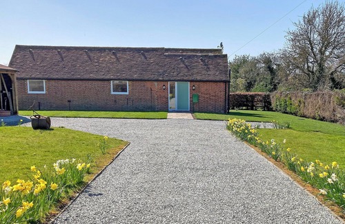Bedroom 4: 2 x Single (3ft) Beds. Oil central heating (underfloor on ground floor), electricity, bed linen, towels and Wi-Fi included. Travel cot, highchair and stairgate. Welcome pack. Lawned garden with patio, garden furniture and barbecue. Private parking for 4 cars. No smoking.. Occupying a countryside location in the Kentish village of Brabourne, this beautifully converted brick barn nestles peacefully with views over the surrounding fields. Step inside and the light, spacious entrance hall welcomes you, ideal for kicking off your boots after a long countryside walk. With an impressive, high, vaulted beam ceiling, flooded with light through the carefully placed Velux, the wonderful open plan living space with comfortable seating and Smart TV is undoubtedly where you will spend most of your time with family or friends, talking over the days plans or simply relaxing together. Leading through to the dining area, and the contemporary fully-equipped kitchen with two double ovens and large American-style fridge/freezer, this room is perfect for cooking up a feast for the whole family. Relax and unwind with your favourite drink at the oversized breakfast bar with padded stools, while keeping the chef of the group company.
