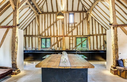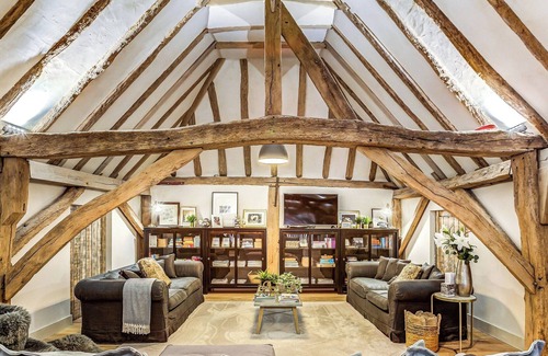 Bedroom 4: With twin beds and pull-out single bed.. Air source heat pump underfloor central heating, electricity, bed linen, towels and Wi-Fi included. Welcome pack. Large back garden with patio and garden furniture. Balcony. Private parking for 4 cars. No smoking. Please note: There is a pond within the grounds. . Welcome to a breathtaking four-bedroom Jacobean barn conversion, a gem featured on George Clarke’s ‘Amazing Spaces’! Nestled amidst the serene countryside, this extraordinary property offers a one-of-a-kind escape for those seeking peacefulness and a touch of history.