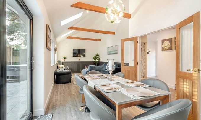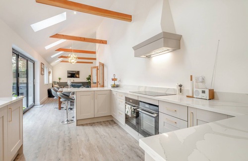 Bathroom: Bath With Shower Over, Heated Towel Rail, Toilet. Electric and underfloor heating, electricity, bed linen, towels and Wi-Fi included. Travel cot and highchair. Welcome pack. Enclosed rear garden with patio, courtyard and garden furniture. Hot tub for 6 (private). Private parking for 3 cars. No smoking. Please note: This property has a natural water supply via borehole. Sorry, no stag or hen parties.. This spacious property has been thoughtfully presented throughout and offers a large, open-plan, social accommodation, all one level, having doors leading onto the pretty, enclosed, paved garden, with your very own hot tub to enjoy. On a balmy summer day, push open the doors to enjoy alfresco dining, and on an evening, why not relax in your private hot tub and watch the stars with a glass of bubbly. In the morning you can enjoy listening to the songbirds, an ideal spot to relax.