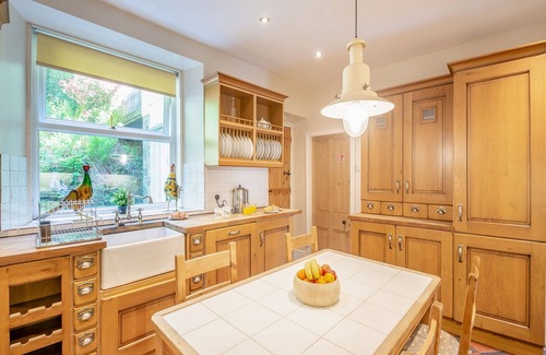 Bathroom: (1 Step), Roll Top Bath, Cubicle Shower, Toilet. Oil central heating, electricity, bed linen, towels and Wi-Fi included Initial fuel for open fire and wood burner included. Cot and highchair. Garden with terrace, patio, garden furniture and chiminea. Ample parking. No smoking. Please note: There are 12 steps and a sloping terrace in the garden.. Dating back to the Victorian era and a former vicarage, this large detached property is located slightly off the A5 historical route between Betws-y-Coed and Capel Curig. The holiday property has been carefully restored retaining many original features, boasting a cosy and atmospheric wood burner, whilst a medieval highgate bed captures the Victorian period. The elevated gardens to the rear (steps may be slippery when wet) overlooks the mountains and local countryside.