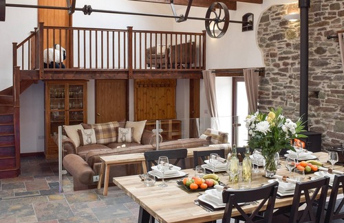 Wheelwright Barn offers spacious living throughout and has been finished to a high standard with excellent levels of comfort. The large, split-level, open plan living/dining room/kitchen has retained all of the original character, complete with beams and the original, Victorian line shaft with cast iron drive wheels within the magnificent vaulted ceilings. The blend of contemporary design and traditional materials used in creating the kitchen, particularly the slate flooring and the original slate salting slab, really sets this kitchen apart. From the kitchen you can enjoy those amazing views and soak in the private, hydrotherapy Jacuzzi hot tub before snuggling down to a cosy night around the wood burner. Every bedroom has unique en-suite facilities, with the master bedroom offering luxurious comfort with a four poster kingsize bed and whirlpool bath. There is also a large private outdoor swimming pool located between the patio and the Orchard, within the grounds.