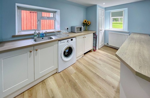 The bay windows in the lounge are a particular highlight, offering a perfect spot to unwind and watch the ever-changing light over the hills. Each of the four bedrooms is comfortably furnished and styled with charming, farmhouse-inspired décor. A spacious utility room makes returning from outdoor adventures easy—ideal for muddy boots and wet gear after a day’s hiking or cycling.