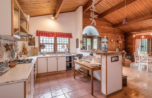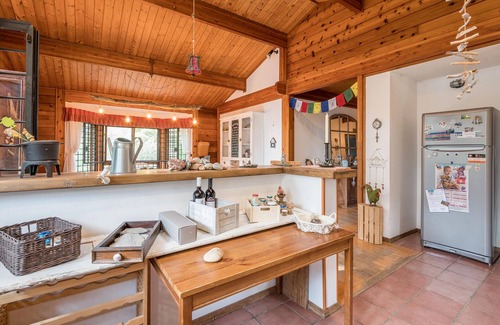 In the spacious living room you will find exposed beams on the high ceiling and a floor covered with wooden planks, while the atmosphere is cozy and inviting. Here you will be motivated to cozy up with your loved ones and delve into your vacation reading. This warmly decorated domicile, invites you to spend relaxing hours with your loved ones and offers you the ideal place to spend a peaceful vacation in Italy. The house is surrounded by a spacious garden, equipped with pallet furniture, to also spend relaxing hours in the idyll of the house.
