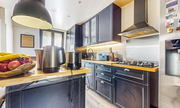 Your charming vacation home is located in the village of Montagny-Sainte-Felicite, just a short drive from Paris. This beautiful house also offers you a spacious property and proximity to beautiful nature experiences. In the morning, take a leisurely stroll through your garden, which resembles a small chateau park, and enjoy a cup of coffee or tea on the stylish terrace. You can then discuss your plans for the day over breakfast together. The cozy living room impresses with its modern furnishings and inviting fireplace. You can relax completely in your whirlpool.