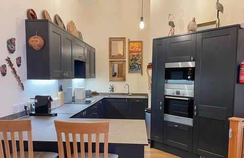 Kitchen area: With breakfast bar, electric oven, electric hob, microwave, slow cooker, fridge/freezer, dishwasher and Nespresso coffee machine.. Oil underfloor central heating, electricity, bed linen, towels and broadband included. Travel cot, highchair and stairgates. Welcome pack. Landscaped grounds (shared with other properties on-site). Decking area. Hot tub (private). Bike store. Private parking for 1 small/medium car, additional parking in public car park (25 yards away, £35 per week, via coin meter). No smoking. Please note: There are 5 steps in the grounds. This property has a security deposit of £500.. This converted 17th-century Fish Cellar is in a stunning location with beautiful beaches literally on the doorstep. Set within a private gated community of five properties, this is a mid-terrace, eco-friendly home with much of the original stone retained to keep the charm and heritage alive. The property is set over three levels and in addition to uninterrupted sunsets and the sound of crashing waves, boasts a host of entertainment including board games, books, music and audiobooks through Amazon Echo, hundreds of DVDs, TVs in most rooms, a PlayStation 3 with games and a Nintendo Wii. For your relaxation you also have available a steam shower, aromatherapy and mood lighting. There is also a private hot tub situated on a decked area of the balcony.