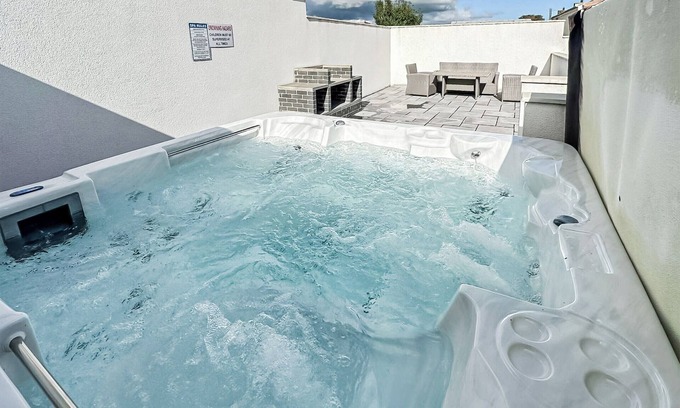 This delightful retreat is the perfect getaway for families and groups, accommodating up to nine guests comfortably. Discover a rejuvenating hot tub in your private courtyard, perfect for soaking your cares away while savouring the fresh village air, whether it’s under the starry night sky or during a sunny afternoon. As you step inside, you’ll be greeted by a spacious, inviting open-plan layout that seamlessly combines the kitchen, dining area, and living room. The heart of the house is undoubtedly the living room, featuring a cosy log burner that adds warmth and character to the space. Plush sofas invite you to relax and unwind, making it the ideal spot for bonding over board games, movie nights, or simply enjoying each other’s company. The well-equipped kitchen boasts modern amenities, allowing you to whip up delicious meals and snacks for your group. The dining area, conveniently adjacent to the kitchen, offers ample seating for everyone to gather and share memorable meals together and is flooded by natural light from the French doors. The master bedroom is a highlight, boasting a super kingsize bed and an additional single bed, making it an ideal family room. Each of the other three bedrooms offers comfortable sleeping arrangements, ensuring a peaceful night’s rest for all.