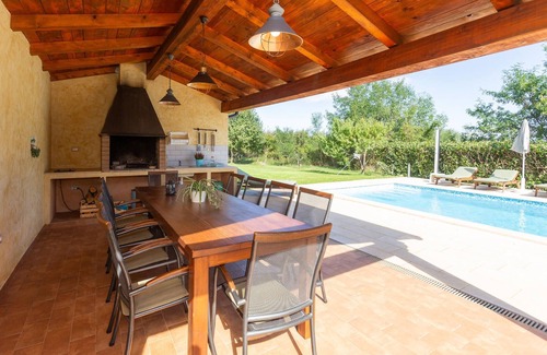 This beautiful vacation home with pool is located in the picturesque landscape of inland Istria. Surrounded by greenery on three sides, it offers peace and privacy in a natural environment. The spacious and comfortable interiors extend over two floors (interior stairs). On the first floor there is a room with table tennis and table soccer, activities that complement the stay in this comfortable house. In the hot summer, a pool and the sundeck offer refreshment and relaxation. Explore the idyllic countryside of central Istria, passing by agrotourism farms. Or visit the beautiful towns along the coast.