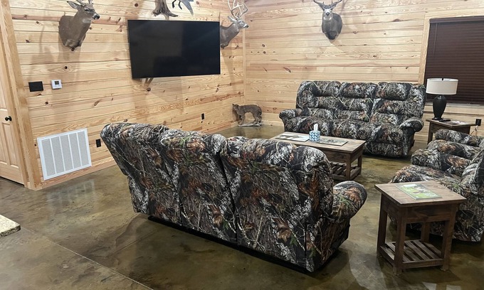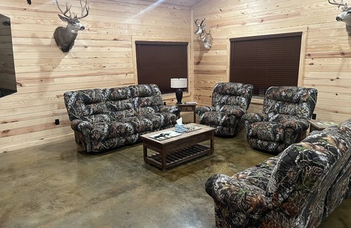4 bedroom cabin situated in a gated hunting property. Keyless entry. Each bedroom has its own bathroom. Full service kitchen, full sitting room with big screen satellite TV. Outdoor patio with 2 swings and 2 TVs. Each room has satellite tv. Cabin sits on the pond bank. The pond is stocked with bass, catfish, and bream. Outdoor fire pit provided. Quiet, quaint area but only 7 minutes from Saracen Casino.