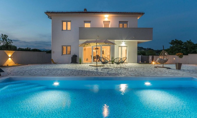 In the hilly hinterland of the Dalmatian Adriatic coast you will stay in this modern house that promises comfort all along the line. You have access to a spacious, fully fenced garden, ideal if you are traveling with children and pets. The large pool is lined with sun loungers, next to it you will find an inviting covered outdoor kitchen area with a barbecue, where you can spend long social evenings in a convivial atmosphere.