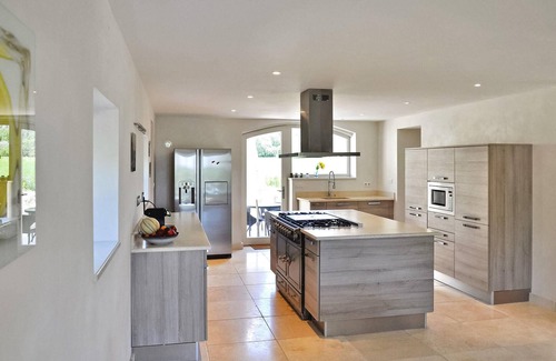 The farmhouse features a ground floor with an open kitchen connected to the dining room. It offers access to the second terrace. A spacious dining room and sitting area with a French window providing garden access and a view of the pool. There's also a sitting area with a sofa and TV. One air-conditioned bedroom with pool access and views is on the ground floor. On the first floor are the remaining bedrooms.