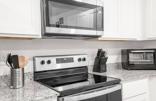 The open-concept layout seamlessly connects the living room to the fully equipped kitchen, creating a warm and inviting atmosphere. The kitchen features modern appliances, ample counter space, and all the essentials to whip up delicious meals during your stay!