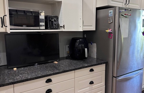Kitchen is stocked for basic cooking. Coffee pot, stove/oven, microwave, toaster and air fryer available for use. Washer and dryer on site in the kitchen.