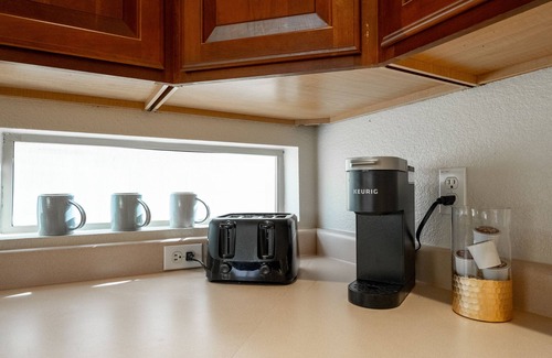 Stocked kitchen with all new (as of 11/2021) pots and pans, Keurig and waffle maker! 2 sizes of pyrex casserole dishes, pie dish, mixing bowls, and measuring cups.