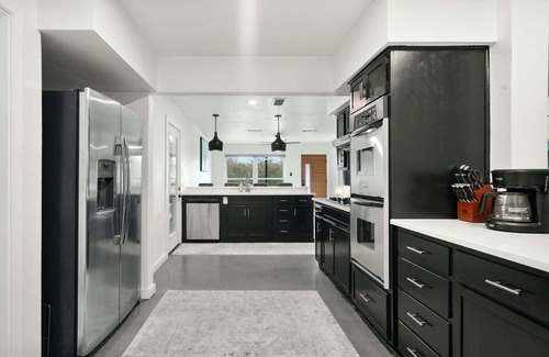 Step into the home’s interior and into an experience of relaxation and sophistication. Contemporary furnishings pair well with simple, modern décor, giving life to spaces that promote connectivity. Curl up on plush sofa seating in the living room as you keep up with your favorite stream-ready shows on the smart TV. The fully equipped kitchen is a chef’s delight showcasing stainless steel appliances, glossy stone countertops, and sleek dark cabinetry stocked with cookware and dining ware for the convenience of preparing meals right at home. You’ll have your choice of dining options whether you gather together for formal meals at the chic dining table with seating for 6, grab a high-top stool at the counter to snack on some appetizers, or head out to the deck to enjoy a meal al fresco in the fresh air and lush surroundings.