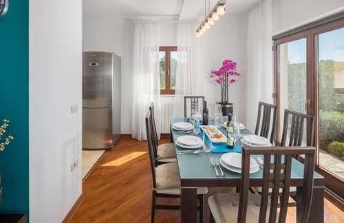 This beautiful vacation home with pool is located in green surroundings and surrounded by olive trees. It is spacious and comfortably furnished. Next to the pool is a tavern with kitchen, dining and living room. Near the house there is a restaurant where you can taste local specialties. On the many bike paths you can discover the famous wineries. In Savudrija, the westernmost point of Croatia, you can visit the famous lighthouse, built in 1826. It is considered the oldest and the northernmost lighthouse in Croatia. Visit the famous ATP tournament that takes place in Umag every July.