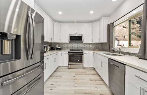 The kitchen is equipped with all the necessary cookware, refrigerator with water and ice, gas stove oven, dishwasher, plenty of cleaning supplies like Paper towels or Cascade Premium dishwasher detergent, microwave, Nespresso machine, pour over coffee and gourmet coffee beans with Grinder included, rice maker, lobster tools, OJ press, waffle maker, Ninja blacks blender, Kitchen Aid food processor, mix stands, immersion blender, utensils, storage containers, dishes and glasses.