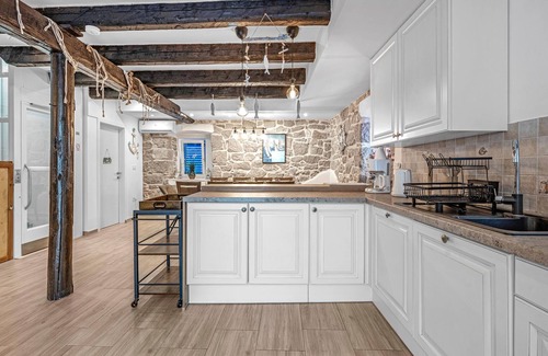 A combination of modern architecture and old walls awaits you in this tastefully furnished vacation home, located directly by the sea in the village of Murter. The island of the same name is connected to the mainland by a bridge. The semi-detached house extends over three floors, which are connected by interior stairs and an elevator. Thus, the domicile is suitable for guests with disabilities, with the exception of two bedrooms and one bathroom. Enjoy the view of the sea and the city on the spacious roof terrace with Jacuzzi. The island is known for its beautiful beaches and its proximity to the Kornati National Park. Taste traditional specialties in the island's restaurants and konobas and experience the charm and flair of Dalmatia.