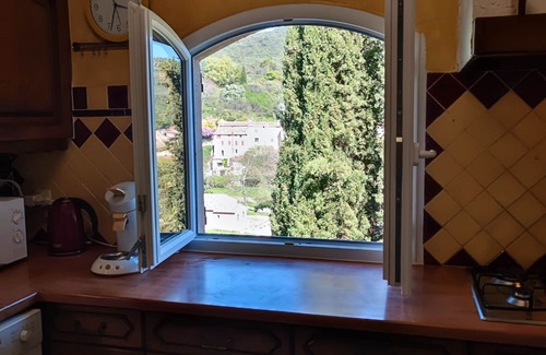 Villa with private POOL in its own grounds. Our Provençal style villa sits on a hillside facing south east with a magnificent VIEW over the unspoiled mediaeval village of Montferrat. It has a stone barbecue. The villa is well kept and comfortably furnished. The villa is suitable for 2 families and is just a SHORT walk from the village. The Lounge opens onto a large, covered Terrace with garden furniture, and a large fridge / freezer. There is a Panoramic view over the Village, superb at night, the gardens and pool nestled on a beautifully wooded hillside, offers both open and shaded lounging areas with complete privacy. The spacious open beamed Lounge with dining area includes a wood stove, leather sofas, color satellite T. V. and DVD Video, CD player. The adjacent modern Kitchen is fully equipped with a double sink, fridge freezer, dishwasher, microwave oven, electric wall oven and a 5 ring gas hob, with a profusion of cooking utensils, cutlery and crockery. There is a large American fridge freezer. A double and twin Bedroom are on the main floor along with a fully furnished Bath / shower / toilet room. A mezzanine gallery leads to the Master Bedroom with antique furniture and king size double bed. The bedroom window overlooks the Pool. Another Bedroom with 2 king size single beds, separate W. C. and shower room share this floor. The floors are covered with beautiful tiles very cool in the summer.