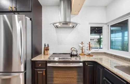 After working up an appetite from exploring all of Cocoa Beach, our modern kitchen has everything you could need for cooking and entertainment! The kitchen features quartzite countertops, beautiful backsplash, stainless steel appliances, and beautiful backyard views.