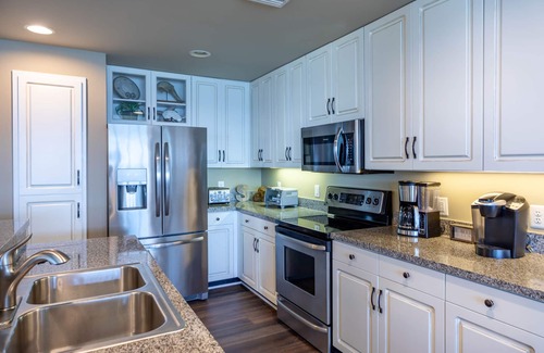This stunning unit boasts top-tier amenities that will make your stay memorable. The expansive 500 square foot balcony offers ample space for outdoor celebrations, complete with a grilling area where you can create lasting moments. Each bedroom is designed for comfort, featuring luxurious beds, HDTVs, and private bathrooms. With accommodations for up to 12 guests—including master suites with king and queen beds—everyone will have their own space to unwind after the festivities. The well-appointed kitchen, adorned with granite countertops and high-end appliances, ensures your culinary needs are met, allowing you to prepare meals and cater to your guests throughout your stay.