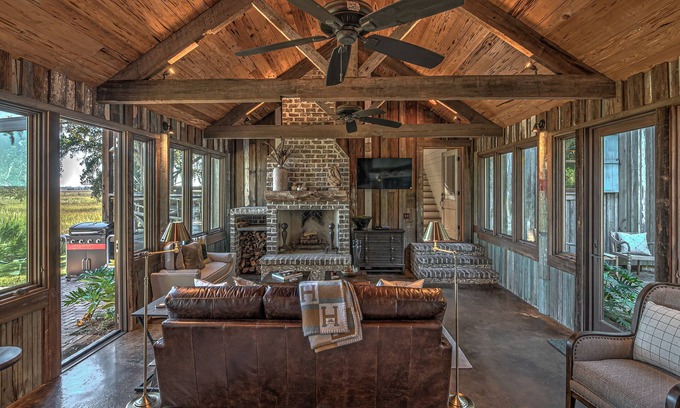 Once inside, luxury accommodations & modern amenities in a historic marsh-front dwelling for 8 await. Features 3 bedrooms & 3 bathrooms, and a game room can be converted easily to a 4th bedroom as it provides a full-sized murphy bed.