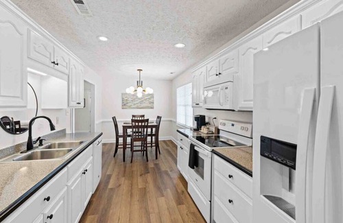 This stunning home comfortably sleeps up to 8 guests, featuring four thoughtfully appointed bedrooms including a luxurious master suite with a soaking tub, two full bathrooms, and a state-of-the-art kitchen perfect for culinary creations. Relax in the inviting living room complete with an oversized couch and Roku Smart TVs in every room for your entertainment. Step outside to enjoy a charming back porch equipped with a swing chair, offering a serene atmosphere for post-ceremony relaxation or morning coffee on your special day.