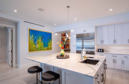 After leaving the sprawling beach with white sand and paved sitting areas, you’ll want to spend time in your lavish unit. Simply take your private elevator up one floor to a private entrance and vestibule. You’ll be welcomed with an open, bright, and airy floorplan and upscale furnishings. The gourmet kitchen is sure to catch your eye as it is equipped with all of the latest, top-of-the-line appliances. The kitchen opens up to a cozy grand room with plush couches, chairs, and a flat-screen TV.