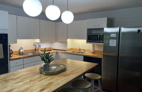 Kitchen includes: Electric stove, oven, full refrigerator, all basic cooking needs (utensils, dinnerware, pots, pans, etc) as well as appliances including coffeemaker, toaster, crock pot and magic bullet blender.