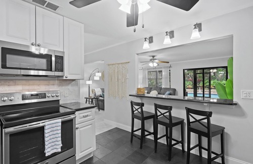 The heart of Villa Paradiso is its open-concept living area, where the kitchen, dining, media room, and outdoor spaces seamlessly blend. Sliding doors connect the indoor living room to the screened patio, private heated pool, and deck area, allowing you to flow effortlessly between spaces. The updated kitchen features stainless steel appliances and a large countertop bar with high stools—a natural gathering spot for family and friends.