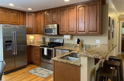 Please note - these are two separate units with no connecting door between the units. In each unit, guests will enjoy a lovely kitchen with granite counter tops, stainless-steel refrigerator, stove, dishwasher, and other appliances to make meals a breeze – including a coffee maker, toaster, blender, crockpot, and an array of pots and pans. And, whether you’re enjoying a takeout meal from the many local restaurants or cooking a meal yourself, each kitchen is stocked with many basics to make grocery shopping less stressful. You’ll find stocked items that include coffee, creamer, sugar, flour, salt, pepper, cooking oil/spray, mayonnaise, ketchup, mustard, etc. Each home has a dining table with seating for 4 guests, with additional seating at each kitchen island.